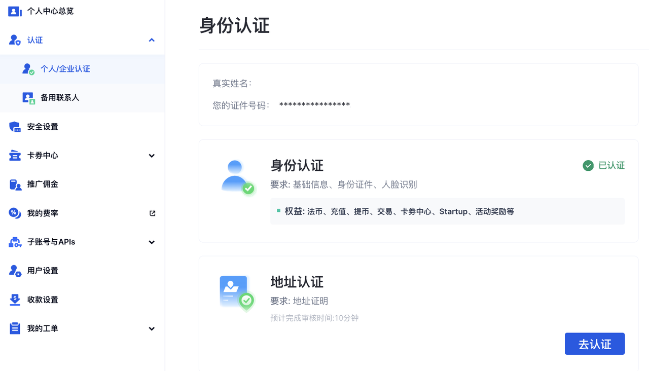 身份认证审核通过后,可以继续点击【去认证】进行地址认证。
