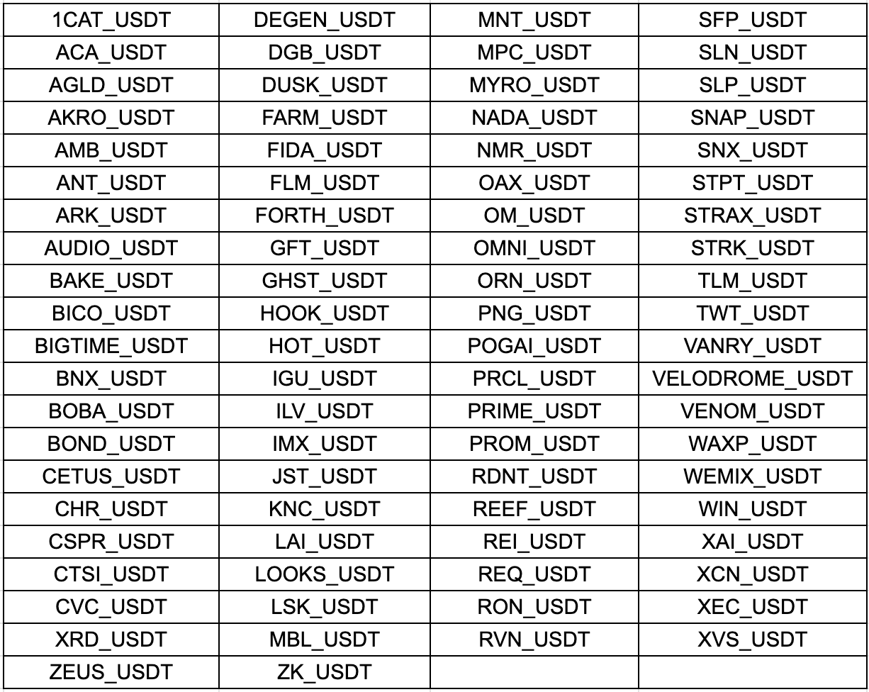 为了进一步优化跟单体验,充分保障跟单用户的权益,使带单收益和跟单收益最大程度趋于一致,实盘跟单目前已下架部分合约带单市场,详情如下: