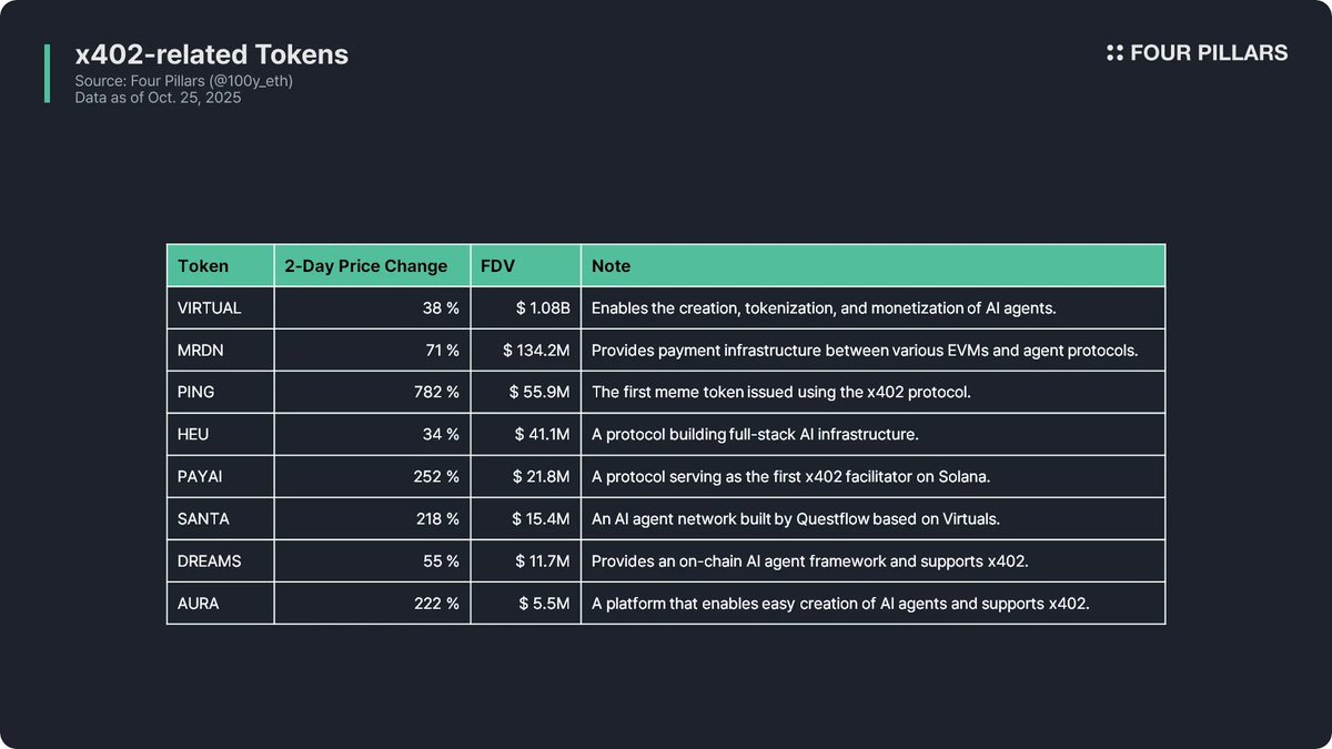 x402 进入炒作阶段的最明显标志是相关代币价格的急剧上涨。例如,每当 AI agent 叙事回归时,$VIRTUAL 两天内上涨 40%,其他相关代币也大幅飙升。