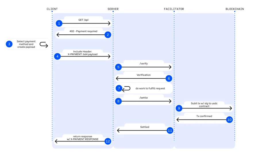 3. 服务器将交易转交 Facilitator,由其在区块链上验证并处理支付。