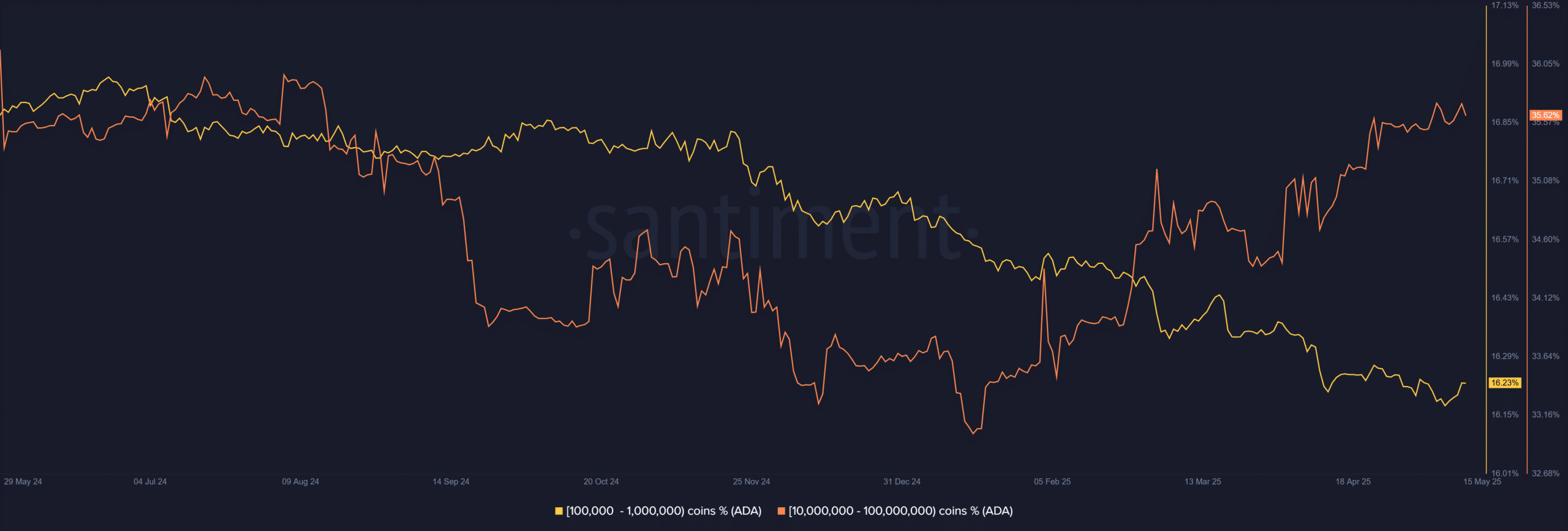 来自 Santiment 的数据显示了一个明确的重点:持有 1000 万至 1 亿个 ADA 的钱包控制着总供应量的 35.62%——使这个鲸鱼集团成为 Cardano 链上结构的主要主导力量。紧随其后的是持有 10 万到 100 万 ADA 的钱包组,占比 16.23%,被认为是最大的中档流动性层。