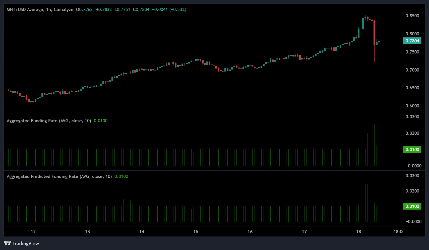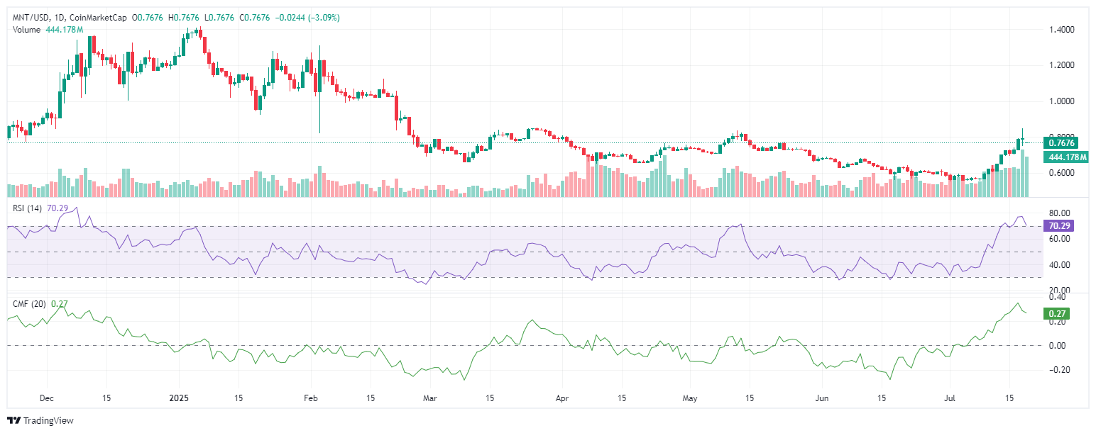在撰写本文时,MNT 的交易价格为 0.796 美元,在过去七天内上涨了 28.2%。尽管市场波动加剧,MNT 仍然保持强劲的上涨势头。