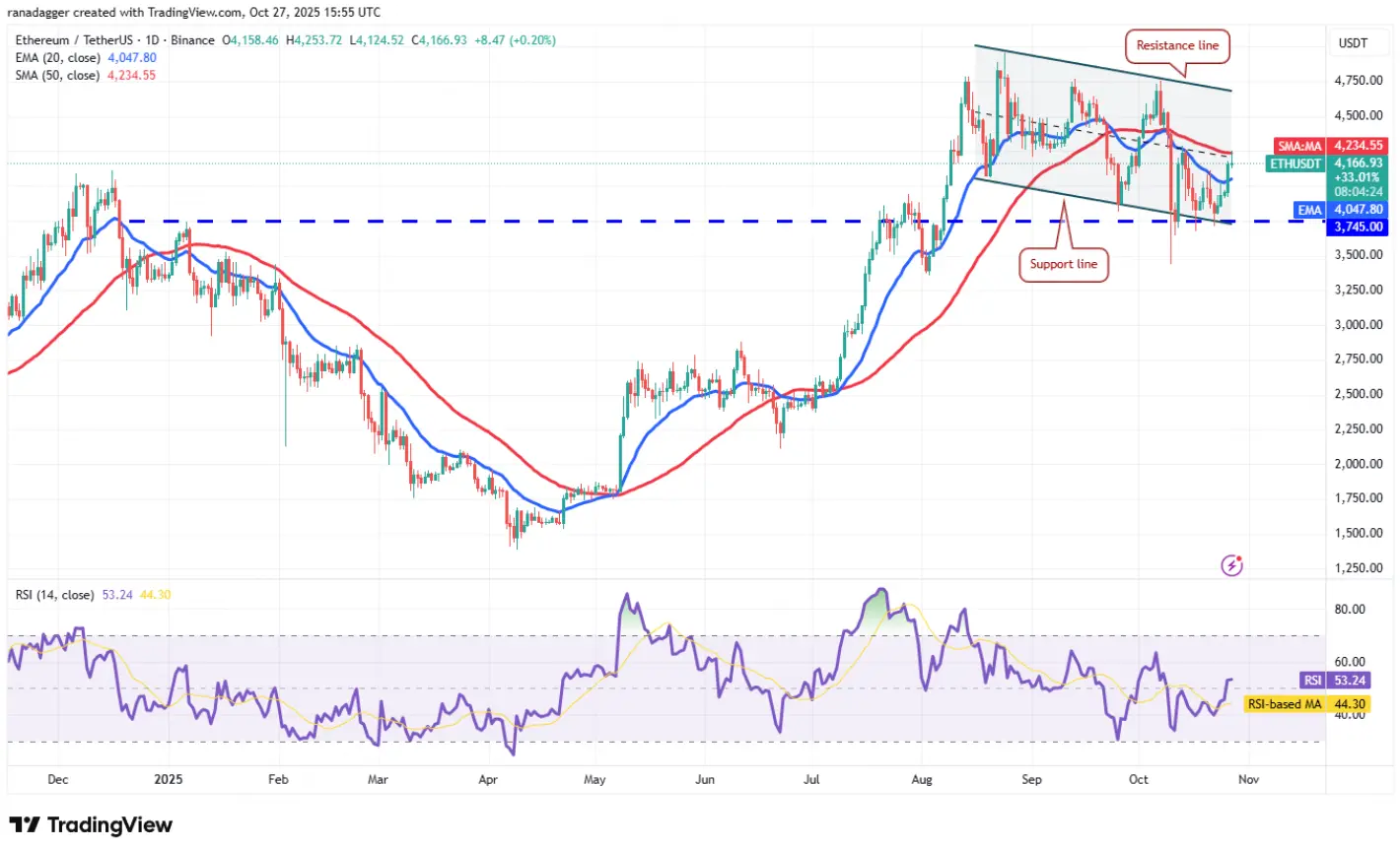 以太坊在触及50日SMA($4,220)后再度回落,显示空头仍在高位积极出手,整体趋势依然偏弱。当前价格正在逼近下降三角形的支撑线,这是决定短期方向的关键位置。一旦该支撑被有效跌破,ETH/USDT可能进一步下探至$3,350甚至更低。