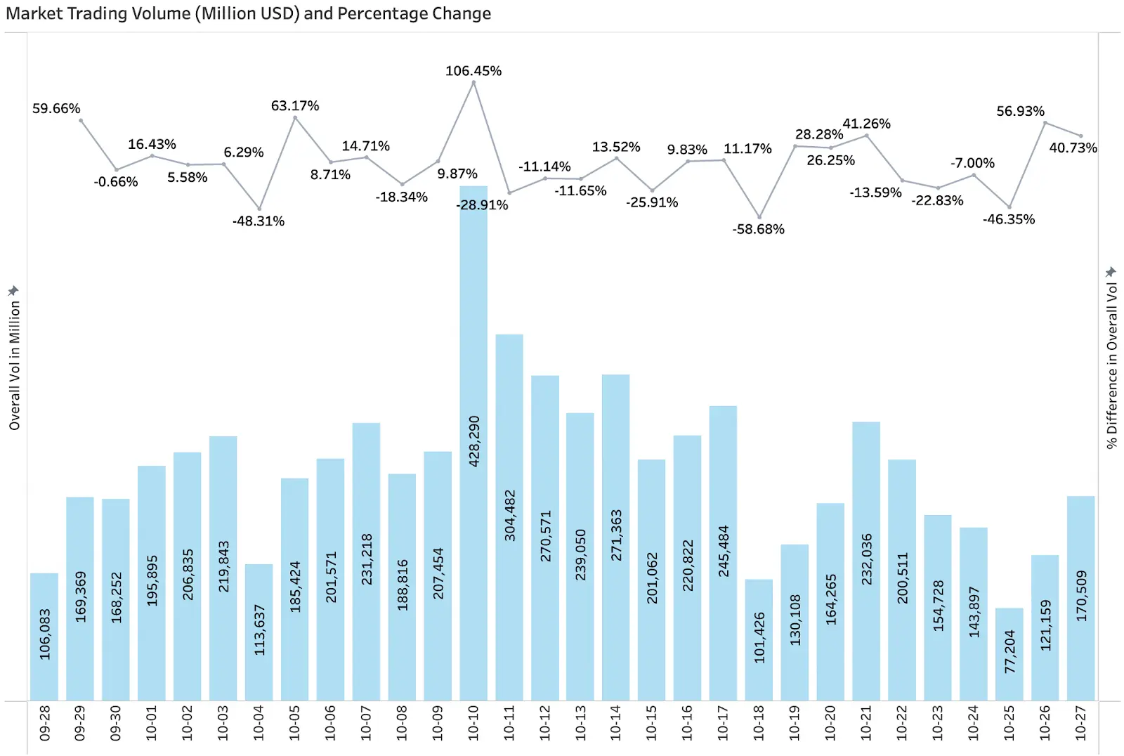 据 CoinGecko 数据,截至10月27日,加密货币总市值为3.94万亿美元,较上月下滑0.57%,月初至10月9日期间加密总市值持续小幅上升,从3.96万亿美元增至4.32万亿美元,反映出资金在阶段性利好下逐步回流。但10月10日至11日市场突发下行,市值日降幅超9%,为全月最大回撤,显示在“10·11”行情中资金出现恐慌性出逃。此后市场虽短暂反弹,最高回升约5.7%,但整体反弹力度有限,市值维持在3.7万亿至3.9万亿美元区间震荡。整体来看,市场在经历剧烈调整后趋于平稳,资金观望情绪增强,增量资金入场意愿不足,仍处于震荡阶段。