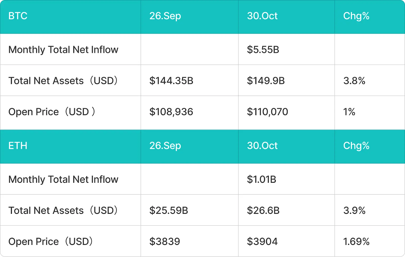 以太坊现货ETF在10月录得约10.1亿美元的净流入,总资产规模增长至266亿美元,环比提升3.9%。ETH价格从3839美元上涨至3904美元,涨幅1.69%。