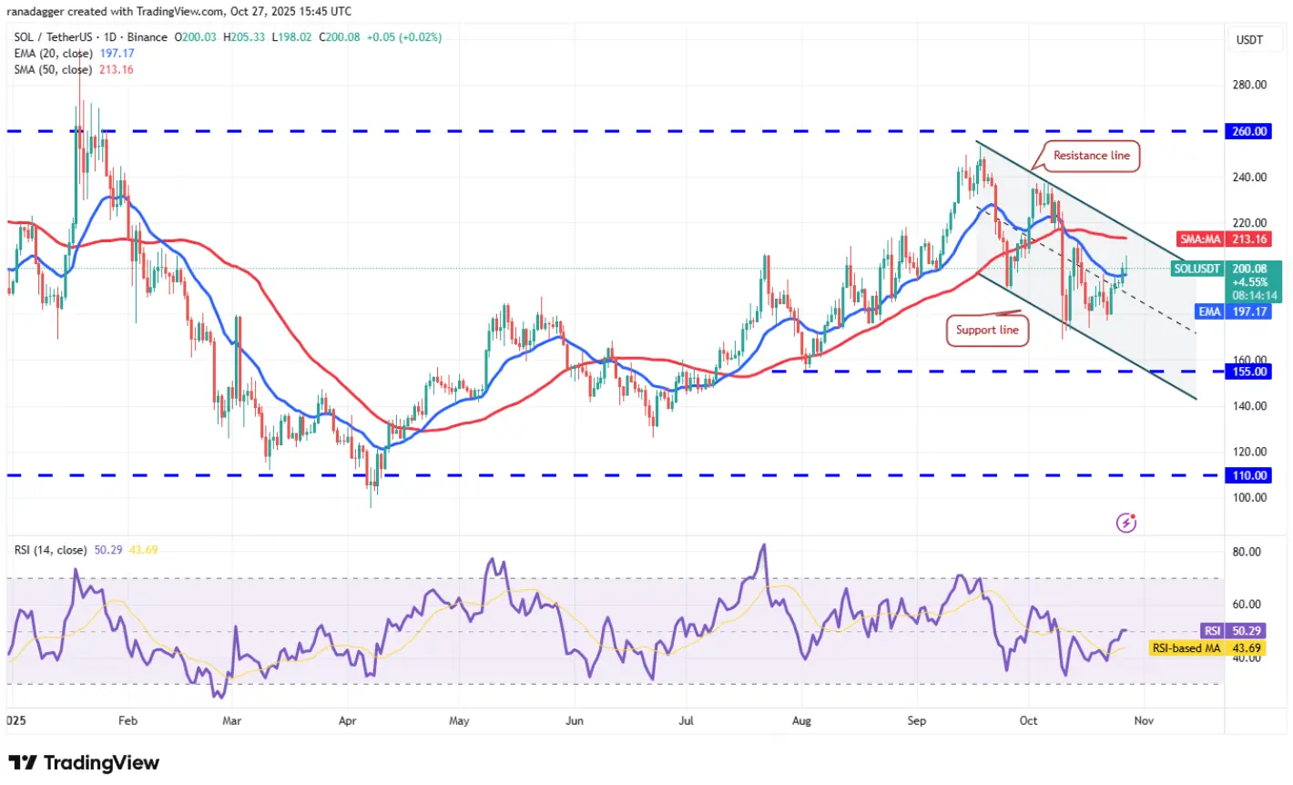 索拉纳一度突破20日EMA($196),但未能稳住涨势,显示高位买盘动力不足。当前20日EMA趋于走平,RSI指标也在中性区域附近波动,表明多空双方处于拉锯状态。如果买方能推动价格并稳稳收在20日EMA之上,SOL/USDT有望进一步上行至通道阻力线,若成功突破该区域,将显著增强市场的看涨预期。