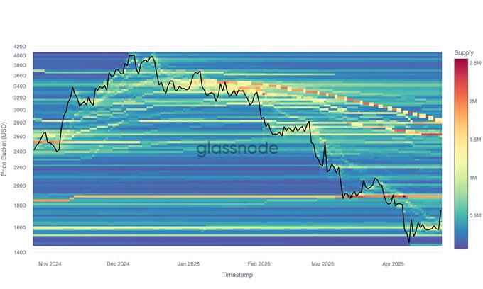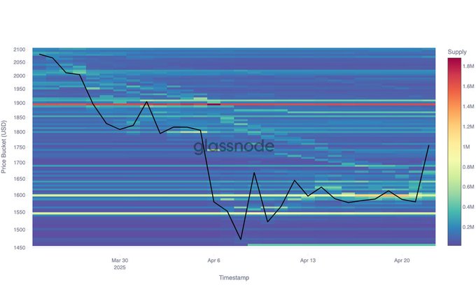 $ETH 成本基础分布显示当前价格附近的下一个主要供应压力位在 $1,895.50,那里集中着 1.64M $ETH。大多数在此水平持有者最后活跃于 2024 年 11 月,买入反弹并推高了他们的成本基础。
