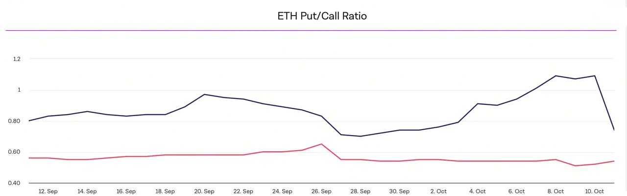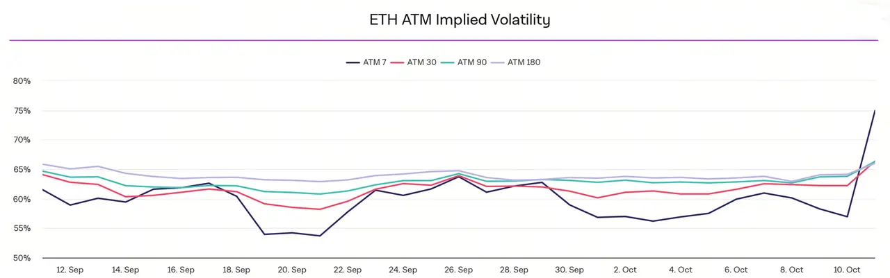 以太坊同样经历了先涨后跌再反弹的剧烈波动周期。自 9 月底收于约 $4,200 起,ETH 在 BTC 带动下上行至 $4,650–$4,700 区间。受宏观利空与流动性紧缩影响,10 月 11 日一度暴跌 17% 至 $3,373.67。不过,随着超跌反弹情绪,ETH 也在周末显著修复,当前已回升至 $4,000点以上,几乎恢复至暴跌前水平。市场资金活跃度回升,短期资金流重新聚焦主流资产,但 IV 维持高位,显示期权市场仍有较大趋势波动。