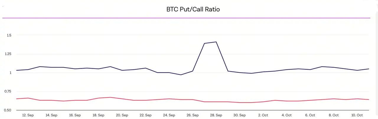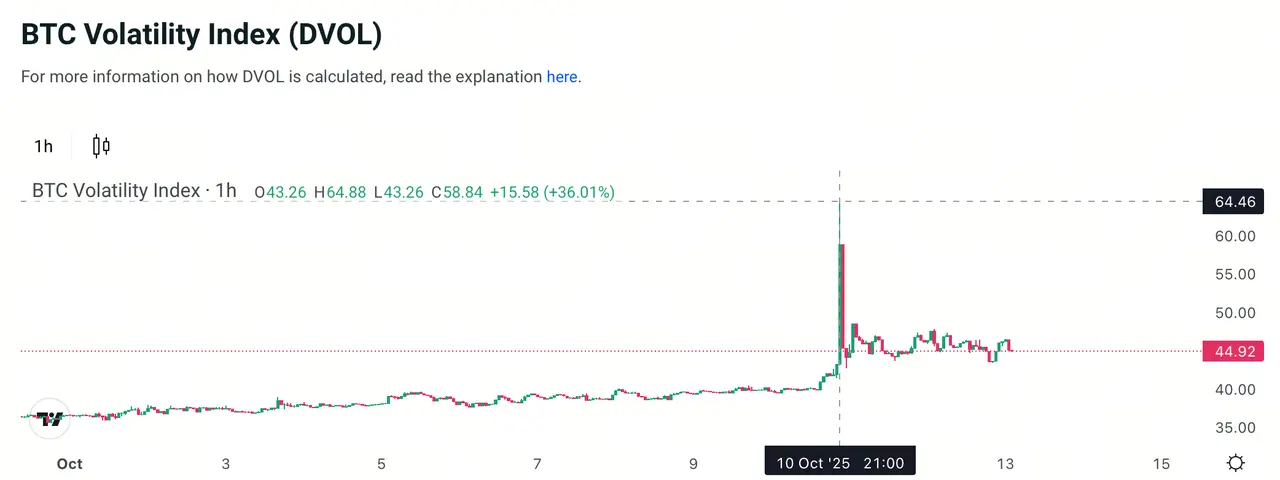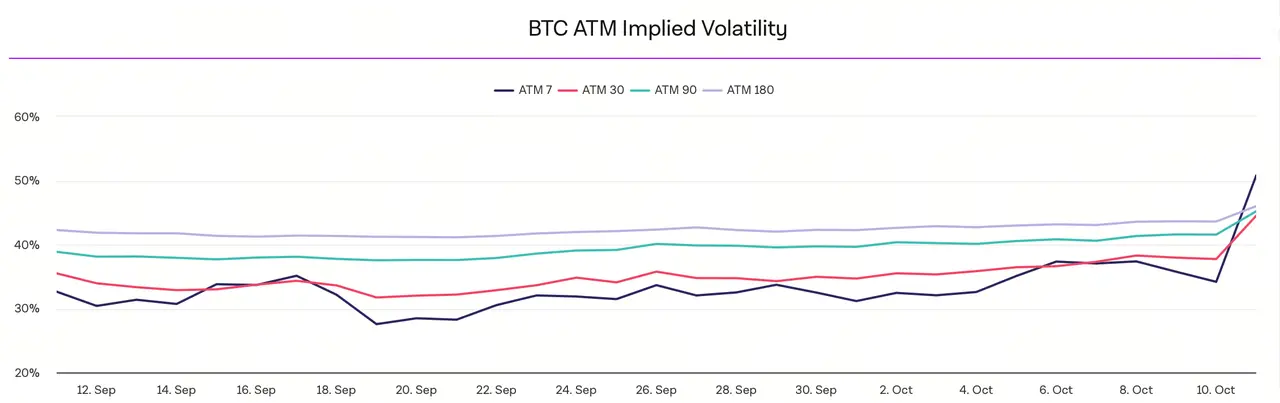 过去两周,比特币经历了从强势上攻到暴跌再到快速修复的剧烈震荡行情。自 9 月 29 日收于约 $112,000 起,BTC 在避险资金推动下于 10 月初突破 $120,000 并创下 $126,200 的历史新高。然而,受美国政府停摆、特朗普宣布对中国产品征收 100% 关税及市场大规模清算影响,10 月 11 日日内一度暴跌 13%,最低触及 $101,500,24 小时清算额超 100 亿美元。 进入本周末,市场情绪逐步修复,资金回流带动 BTC 快速反弹,截止 10 月 13 日早间已重新站上 $115,000–$120,000 区间,基本收复暴跌前失地。期权市场隐含波动率(IV)仍处高位,预示短期趋势波动仍概率较高,可以持仓抓取趋势行情。
