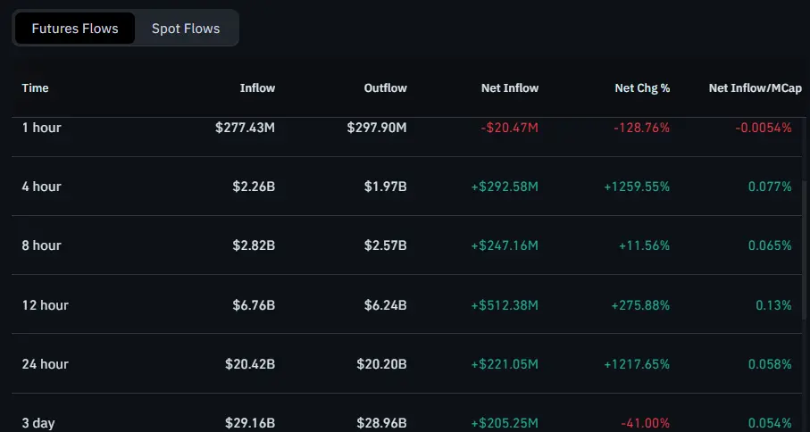 3天数据则显示净流入2.0525亿美元,流入291.6亿美元,流出289.6亿美元,净变动率为-41.00%,反映出与短周期相比,净流入速率有所下降。