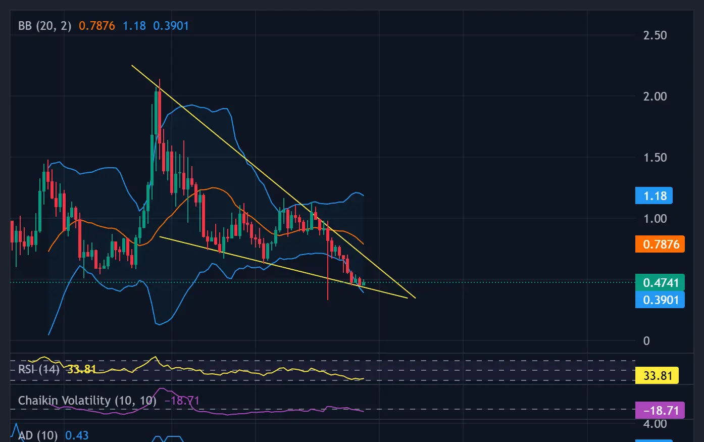 ONDO 周线图显示,从2025年到2026年初,价格一直处于一个长期下行楔形结构内。当前价格已接近波动性可能扩大的区域。
