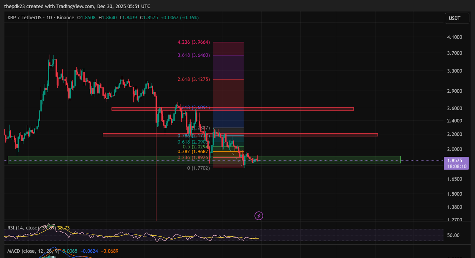 另一方面,日线图确认所有的反弹尝试都被抵消。XRP-USD在多次未能突破$2 水平后,价格在$1.86和$1.91之间波动。自7月突破$3.50高点以来,结构仍然是调整型,低高点和低低点保持完好。