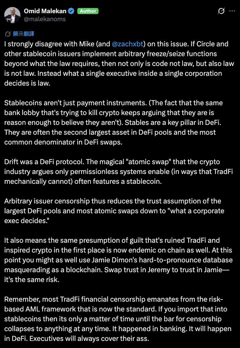 图源:X/@malekanoms 哥伦比亚商学院兼任教授 Omid Malekan 警告,如果允许稳定币发行商在法律要求之外实施任意的冻结或没收功能,将会严重破坏 DeFi 的根基
