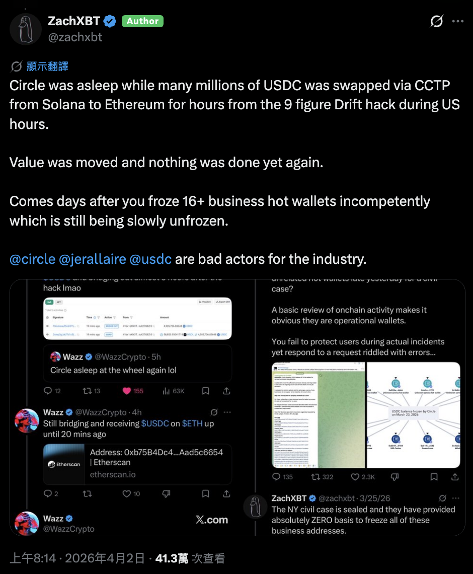 Drift遭黑谁的错?黑客跨链资产却未冻结,ZachXBT痛批Circle失职